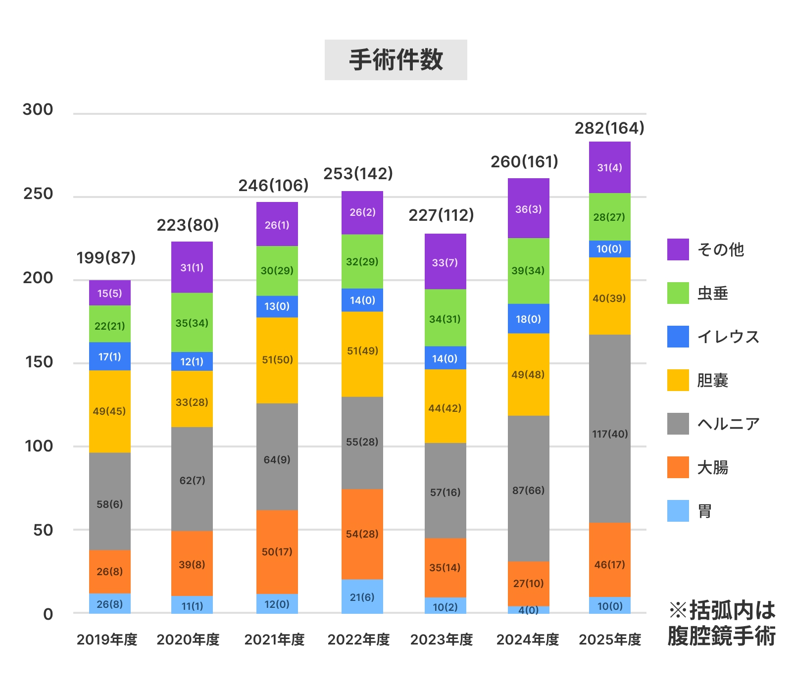 2025年度の総手術件数は282件でした。主な良性疾患は鼠径ヘルニア根治術が114件(腹腔鏡77件)、虫垂切除が28件(腹腔鏡27件)、胆嚢摘出術が40件(腹腔鏡39件)でした。主な悪性疾患は胃癌が10件(腹腔鏡0件)、直腸・結腸癌が46件(腹腔鏡17件)、膵癌3件(腹腔鏡0件)でした。その他の手術は41件でした。